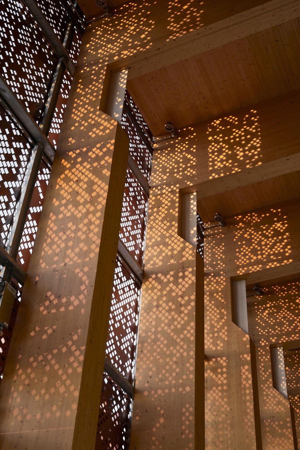 Bölgede hasat edilen ve işlenen ahşaplar, inşaat için doğal bir tercihti. Özellikle kamusal alanlarda tutkal lamine ahşap kirişler ve çapraz lamine ahşap (CLT) döşemeler bulunur. Bu yüzden sürdürülebilir mimaride kullanılan malzemeler tercih edilmiş. İkincisinin çift yönlü taşıma kapasiteleri etkileyici yapısal çıkıntılar sağlar. Kirişler ve döşemeler, iç mekanlardan dışarıya doğru devam ederek manzaraları asfalta yönlendiriyor ve iç dış akışkanlığı destekliyor.