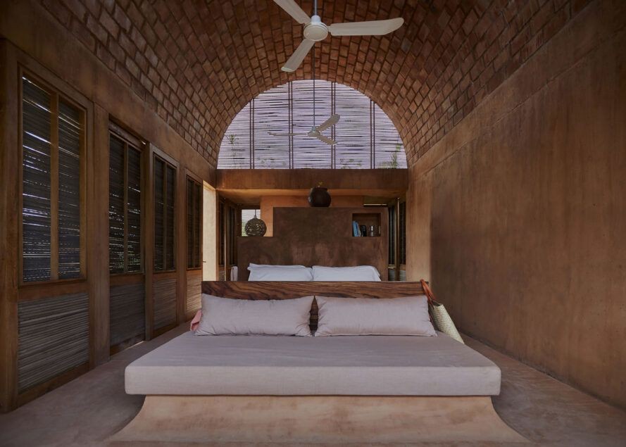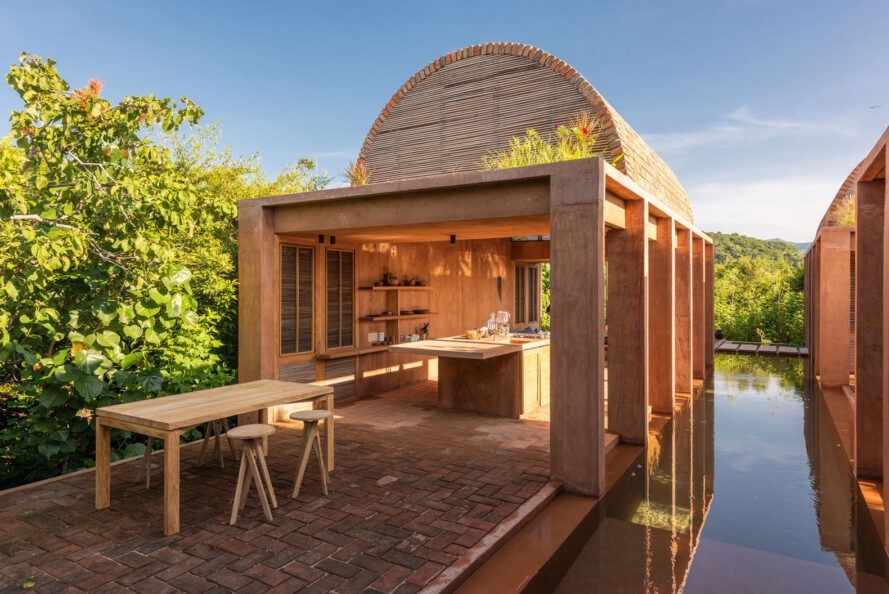 Tasarımın odak noktası tamamen açık yaşam, yemek ve yemek pişirme alanları ile dış mekana hem gerçek hem de mecazi olarak bağlantıdır. Havuzun iki yanında tek kişilik yatak odaları ve banyolar bulunuyor. Bu yuvarlak tuğla çatılar, yakındaki Casa Wabi Vakfı'nın atıkları kullanılarak inşa edildi. Casa Wabi Vakfı'nda kil, bir tuğla fırınında pişirilir. Sürdürülebilir mimaride kullanılan malzemeler tercih edilmiş.