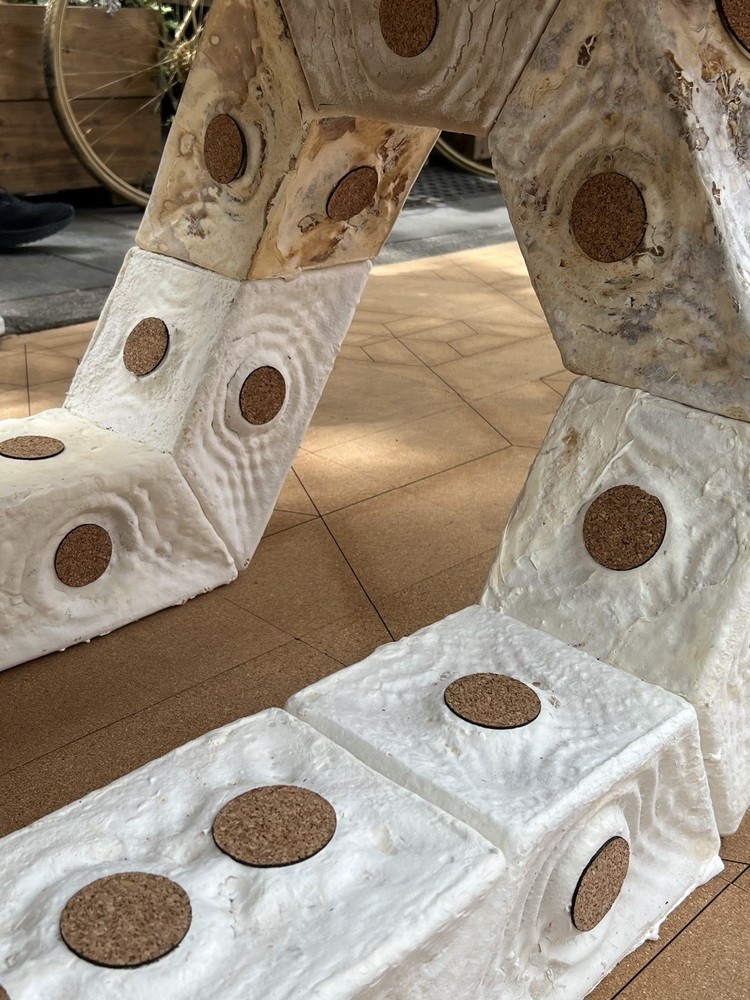"Bir yıl süren kapsamlı deneylerimizden çıkardığımız en önemli keşif miselyumu 3D baskılı ahşapla birleştirme kabiliyetiydi. Çok sayıda deneme ve yanılmadan sonra CDW'de sergilenen blokları meydana getirmek için iki malzemenin doğru karışımını ve kıvamını bulmayı başardık."