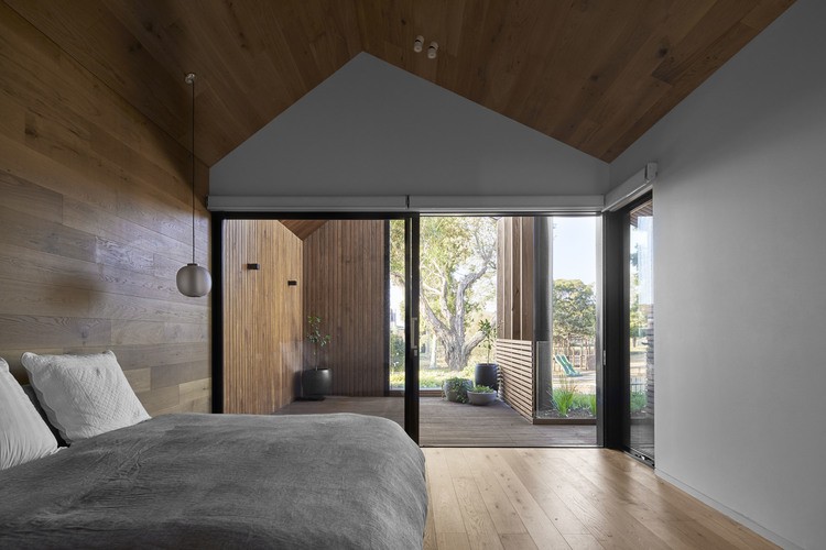 Geleneksel yapı izlerini hatırlatan eğimli kayrak formun çağdaş minimalist ayrıntılarla birleştirildiği projede mimarlar Melbourne Design Studios, banliyö yerleşimine rağmen doğal bitki örtüsüyle çevrili bir yapının bir bağlantı daveti olduğunu hatırlatıyorlar.
