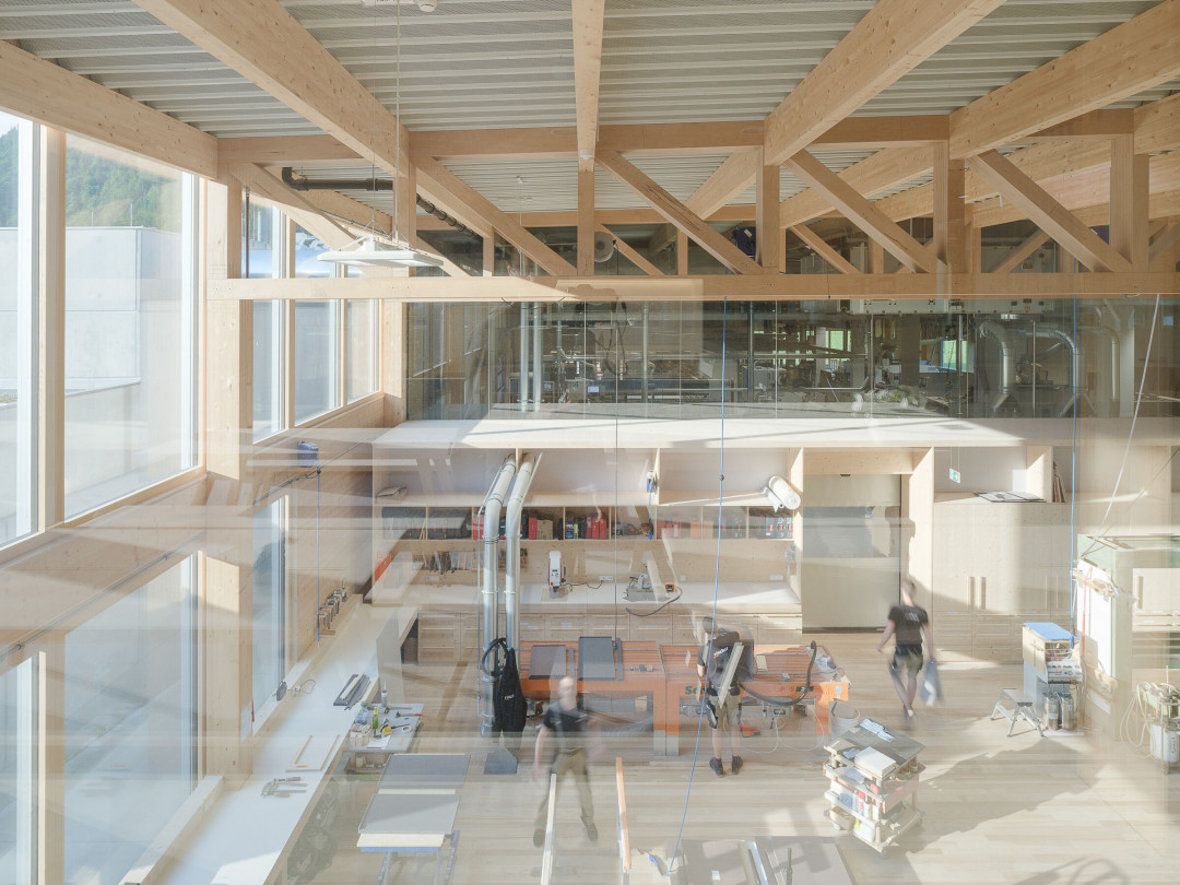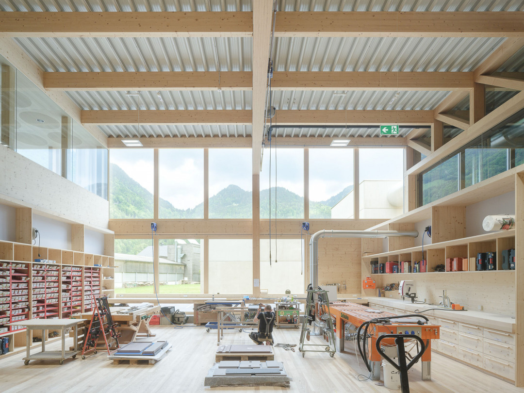 Geniş pencereler, Kanisfluh sıradağlarına bakan manzaralar sunarken, çatıdaki özel aydınlatma ise üretim alanında eşit ve göz kamaştırmayan bir ışık sağlıyor. İki kat yüksekliğinde inşa edilen makine salonu, esneklik sağlarken, ofis, müşteri alanı ve sergi salonu gibi birimler kuzey kesimde yer alıyor. Ahşap işleme alanında kullanılan kayın ağacı makaslar, salon boyunca geniş manzaralar sunuyor.