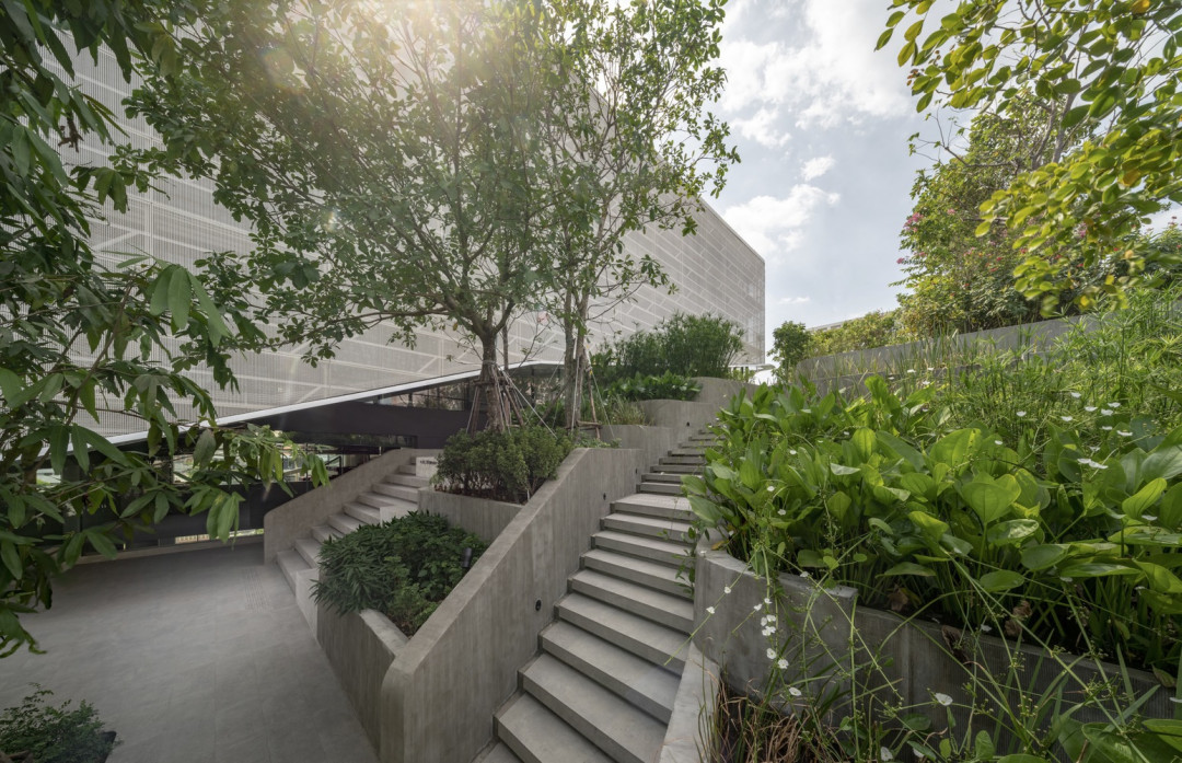 Bina iki bölüme ayrılmış: alt bölge ve üst bölge. Alt bölge, Tayland modern mimarisinin bir dönüşümünü ve halk için devasa bir yeşil alanı sergiliyor. Cephe, ofis alanı için bir güneş kırıcı olarak hizmet veren dikey ve yatay desenlere sahip. Üst bölge, sadece enerji tüketimini azaltmakla kalmayıp aynı zamanda minimum doğal ışık gereksinimi olan işlevsel alanları tanımlayan delikli alüminyum cephe içinde gizli mühendislik teknolojisinin heykelsi bir formunu sergiliyor. Çatı bahçesi, alt ve üst bölgeler arasında bir geçiş alanı görevi görerek kentsel ısı adası etkilerini etkili bir şekilde azaltıyor.
