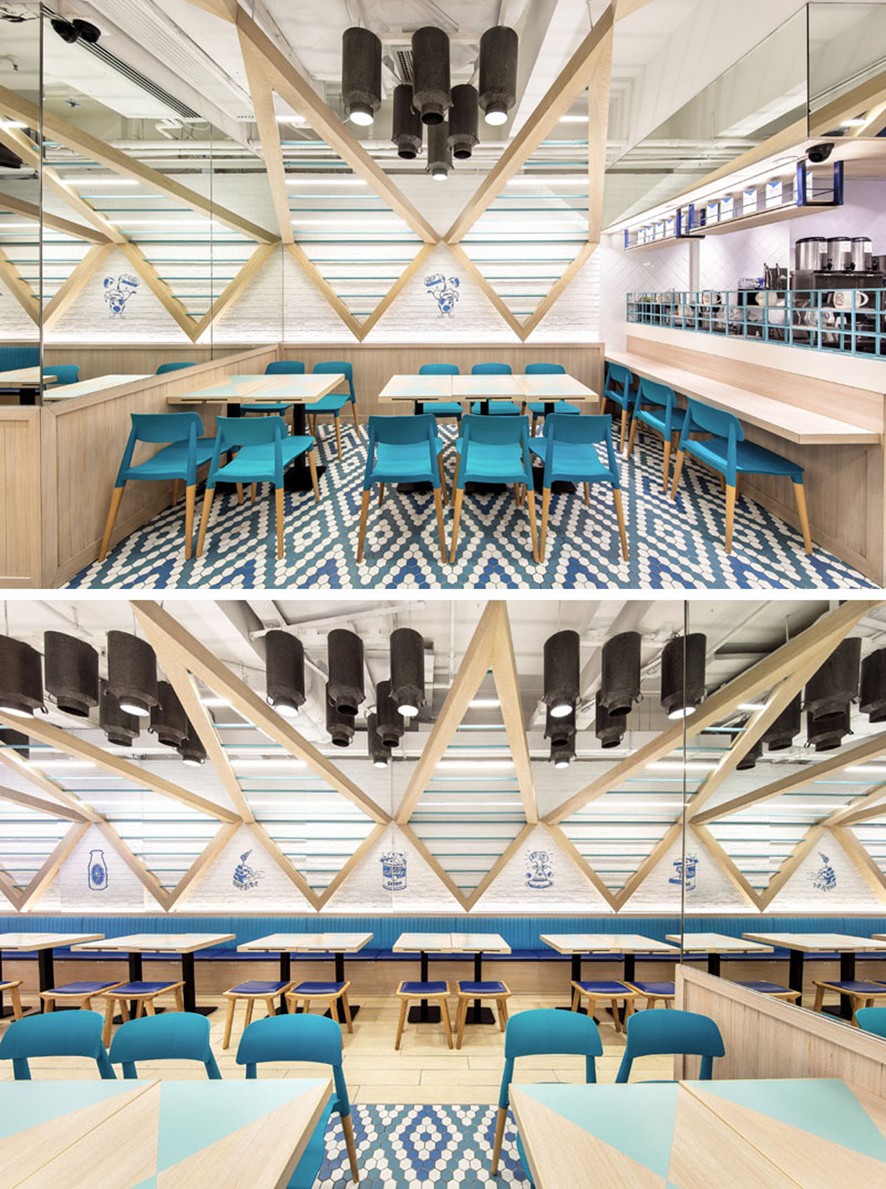 Tasarımında eğik çatı, bağımsız posta kutusu ve dış görünüşte parlayan dış kısımlar gibi geleneksel süt çiftliği unsurlarından esinlenen restoranda, altıgenler, parlak mavi renk ve kutuların yaratıcı kullanımı dikkat çekiyor. Restoranda ahşap, geleneksel bir süt çiftliği üzerinde çatı görünümünü oluşturmak amacıyla duvar ve tavanlarda kullanılmış.