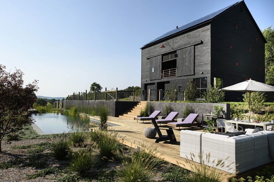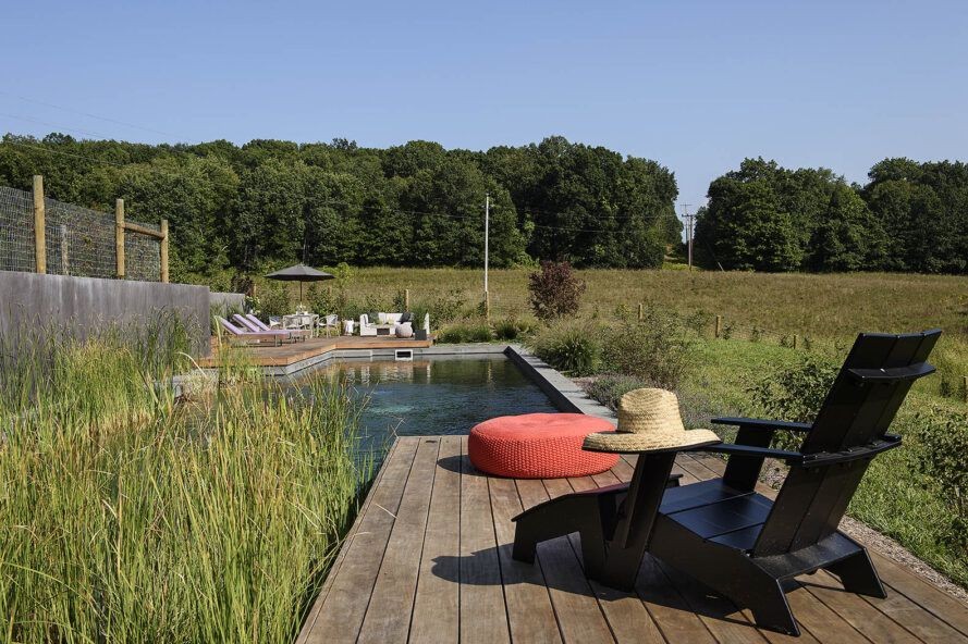 BarlisWedlick'in müdürü Alan Barlis, New York Hudson Valley'de 75 dönümlük bir arazi için doğal bir yüzme havuzu tasarladı. Proje bir ekip işiydi. BarlisWedlick, havuzun, güvertelerin, sert peyzajın ve malzemelerin tasarımına öncülük etti. Havuz oluşturucu Vinny Torcasio ve Biotop, havuz filtreleme / mekanik sistemini tasarladı ve peyzaj mimarı Anthony Archer-Wills, havuzun etrafındaki yumuşak peyzaj ve dikimlerden sorumluydu. Yüzme alanı yaklaşık 16'x62 ′ ve ekilen su bahçesi yaklaşık 14'x20 ′ boyutlarındadır. Yapı, tümü yeni bir geleneksel havuz için tipik olan alçı kaplamalı gunittir (beton esaslı). Su bahçesinde bitkiler bir kum / çakıl yatağına ekilir. Çevredeki güverteler garapa ağacından yapılmıştır.
