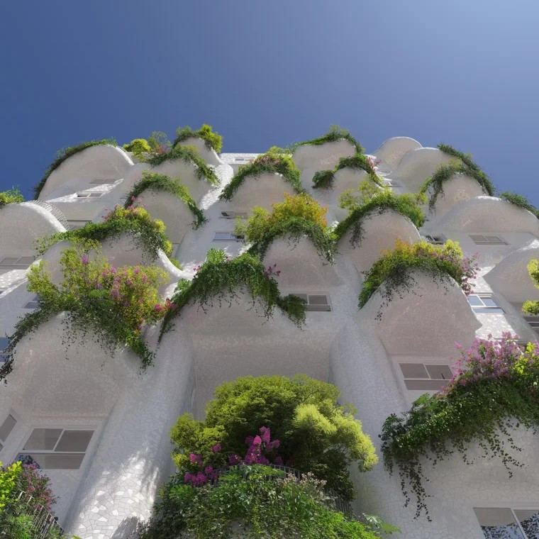 Organik formların hâkim olduğu tasarım, balkonlardan cephe boşluklarına kadar her noktada yumuşak geçişler sunuyor. Antoni Gaudí’nin etkisini hissettiren düzensiz beyaz seramik karolar, binaya hem el işçiliğini hatırlatan hem de ışıkla değişen canlı bir görünüm kazandırıyor. Cephede yer alan teraslar, özel saksılar ve yeşil cepler sayesinde bina yıl boyunca yaşayan bir peyzaj barındıracak. Biyofilik…