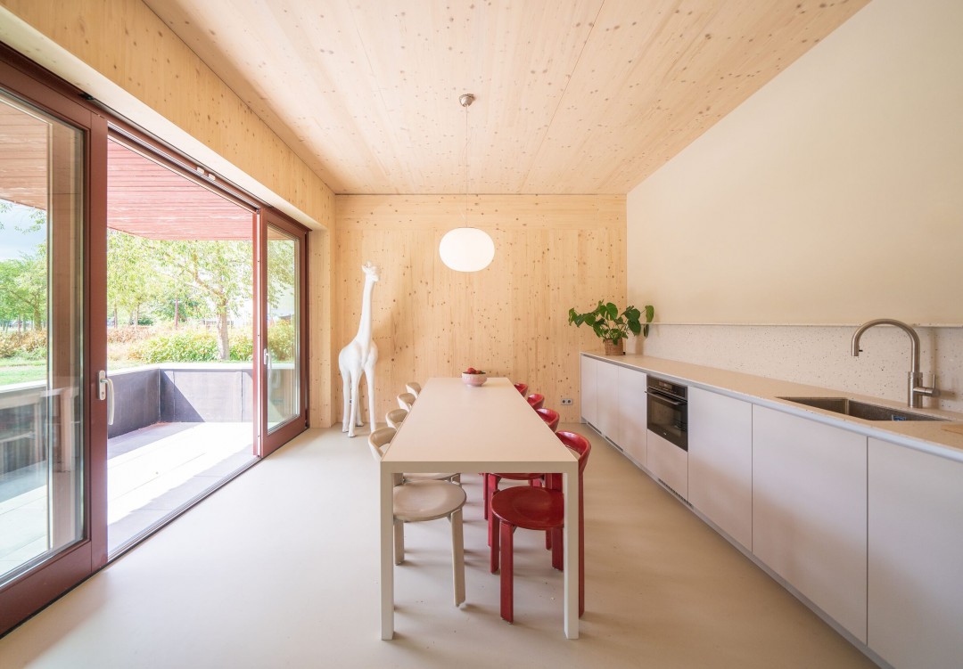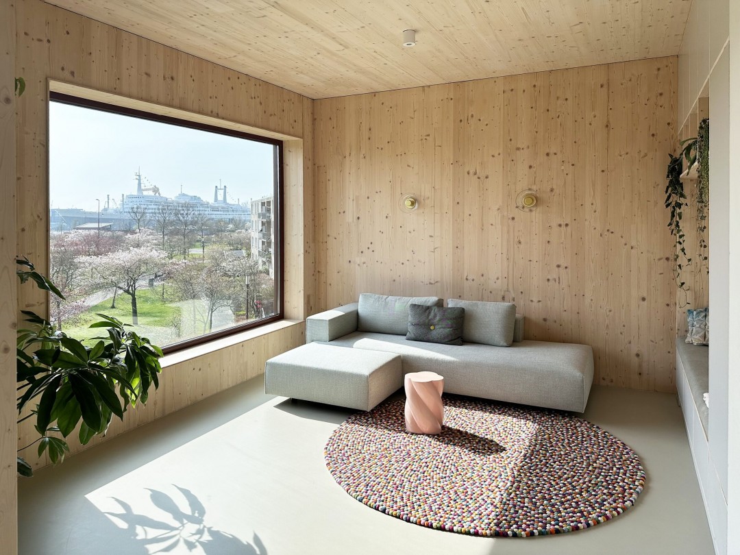 Sürdürülebilir mimari binanın neredeyse tamamı ahşaptan yapılmış. CLT'den masif ahşap zeminler, ahşap iskelet duvarlar ve ahşap kaplamalarla birleştirilmiş. Zeminlerin altı bitmediği için CLT evlerin her yerinde görülebilir. Bu nedenle sürdürülebilir mimaride kullanılan malzemeler tercih edilmiş.