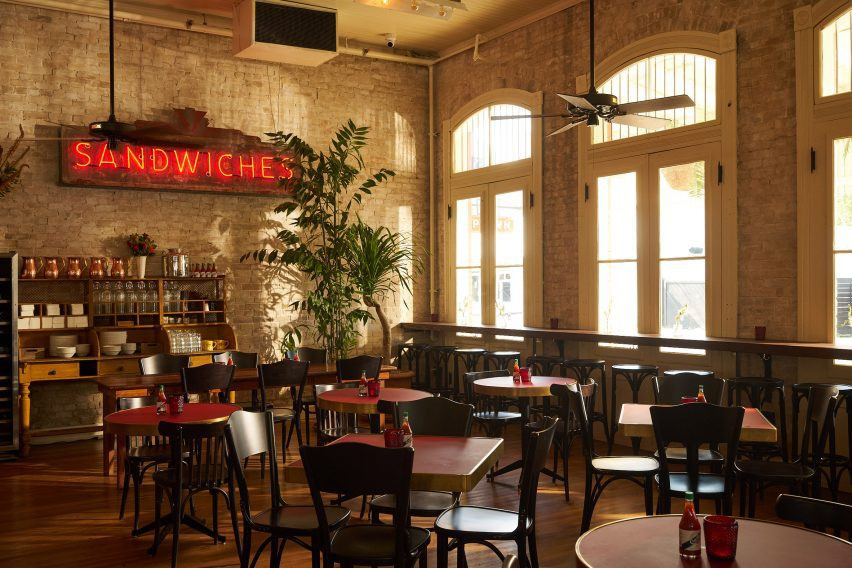 Teksas merkezli Michael Hsu Office of Architecture, Austin’in doğusunda yer alan ve 130 yıllık bir geçmişe sahip olan tarihi binayı, “eski dünya ile yeni dünyanın buluştuğu” her güne açık bir restoran, bar ve buluşma alanına dönüştürdü.