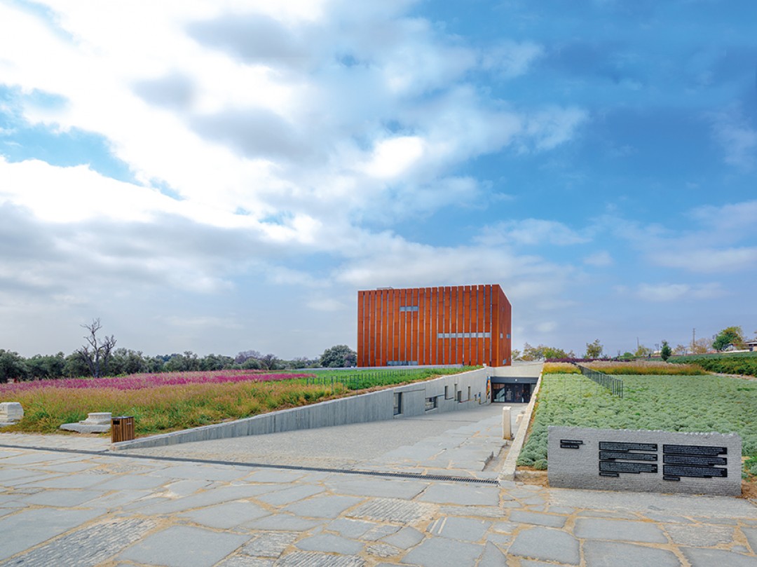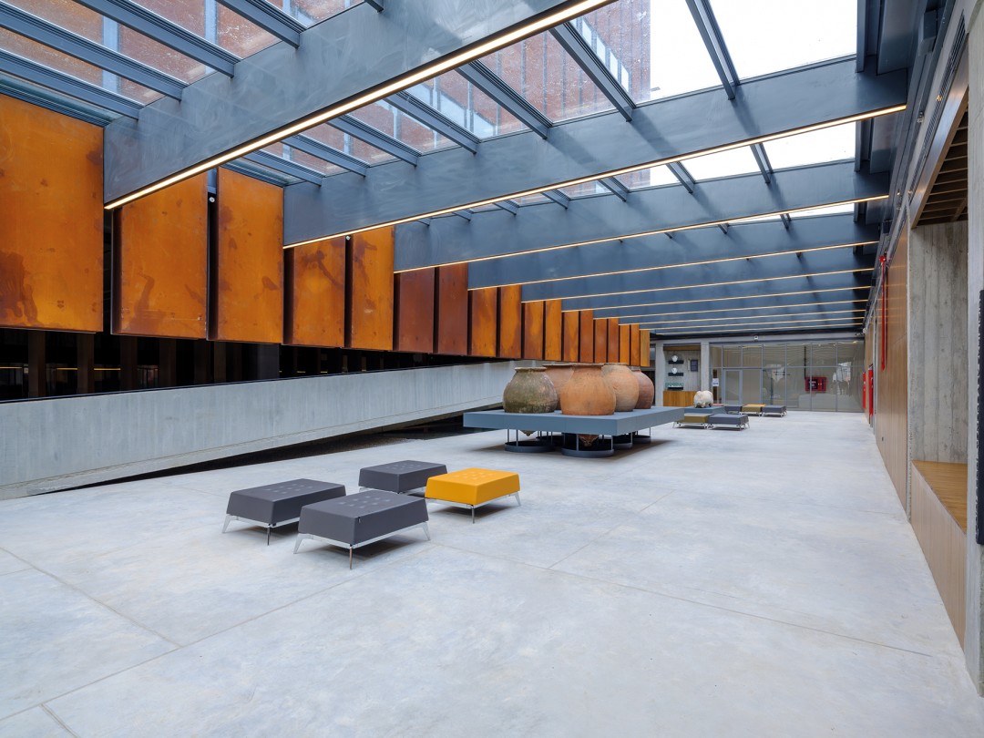 Ziyaretçi içeriye girdiğinde kendini bir sirkülasyon bandında buluyor. Pas kırmızısı, toprak rengi sergi yapısı, şeffaf çatıdan yeryüzüne doğru yükseliyor. Paslanmış metal (corten) kaplı yapı, bu haliyle topraktan çıkarılmış kırılmış testiler ve çömlekler gibi biraz çizilmiş, bozulmuş, kendine özgü dokusuyla ardında bir yaşanmışlık ve bir geçmişi olduğunu hissettiriyor. O döneme ait olmasa da malzemenin ve mimarinin geçmişi, günümüz ve gelecek arasındaki bağa dair bir şeyler söylediğini hissettiriyor.