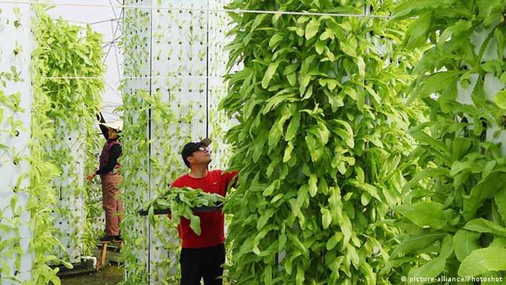 Bu topraksız süreç, böceklerin ve yabani otların büyüme ortamına girme riskini en aza indirerek çok daha temiz ve basit bir süreç sağlar. Bu fideler bazen dikey bir raf sisteminde dışarı doğru değil, yukarı doğru istiflenen büyüme tepsilerine yerleştirilir. Bitkilerin dikey entegrasyonu, çiftçilerin büyüme alanlarının toplam alan kullanımını optimize etmelerini sağlar. Bu sistem, çiftçilerin arazi kullanımlarını %90-99'a kadar azaltmalarını mümkün kılarken, aynı zamanda üretkenliği de artırıyor. Dikey çiftliklerde yetişen bitkiler, ya bir büyüme ortamında bulunan bitki köklerine besin ile aşılanmış suyun beslendiği hidroponik olarak; ya da bitki köklerinin serbestçe sallandığı ve besin ile aşılanmış, suyla buğulandığı aeroponik olarak temel besinlerle beslenir.