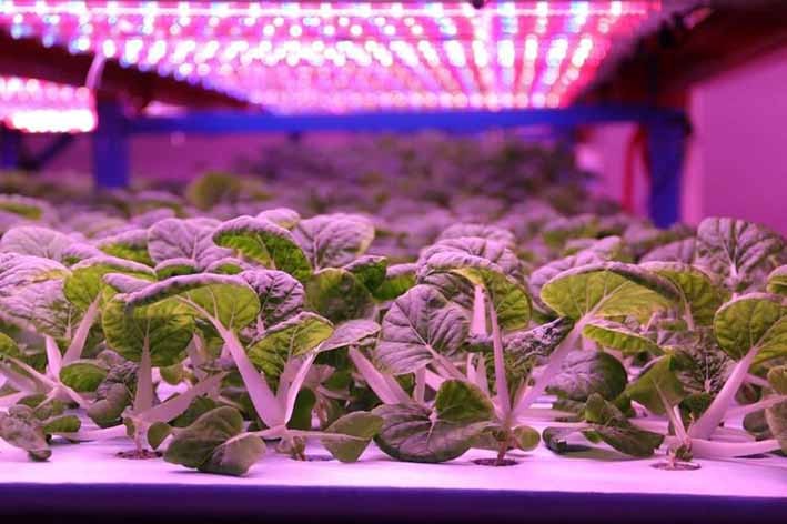 Işık girdileri, ayrıca bitkiler tarafından maksimum absorpsiyon ve maksimum verim çıktıları sağlamak için optimize edilmiştir. Fotosentetik aktif radyasyon veya PAR, farklı bitkilere iletilen kullanılabilir ışık (fotonlar) miktarının bir ölçüsüdür. Bilim adamları, absorpsiyon zirvesinin genellikle 440nm (mavi ışık) ve 660nm (kırmızı ışık) olduğunu bulmuş olsa da, 400 ve 600 nanometre arasındaki aralık, bitkiler için kullanılabilir ışık enerjisi dalga boylarını temsil eder. Bu optimal ışık dalga boylarının verilmesi hedeflenirse, bitkiler tarafından emilmeyecek olan ışığın dalga boyları çıkarılarak bitkilere verilen enerji miktarı optimize edilebilir. Hidroponik çiftliklerdeki bitkilerde sıklıkla görülen morumsu ışığın nedeni budur. Bu aynı zamanda seraların renginin arkasındaki mantıktır: LED ışıklar yoğun enerji kullanıcıları olduğundan yeşil cam, yeşil ışığın bitkilere geçmemesini sağlar. Böylece sadece en kolay emdikleri renkleri alırlar.
