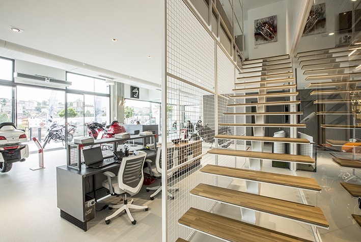 Kat yüksekliğinden kazanılan 150 m2’lik üst katta ise genel müdür odası, muhasebe departmanı ve toplantı odası konumlandırılmış. Bu kapalı hacimler, özel müşteriler ve hobi motor kullanıcıları için konumlandırılan lounge alanlarıyla birleştirilmiş. Bu alanda eğitimler, seyahatlerle ilgili sunumlar ve görsel şovların yapılmasını mümkün kılacak bir ses ve görüntü alt yapısı da oluşturulmuş. Hareketli çelik hasır panolar sayesinde de bu mekanların istenildiğinde kısmen kapalı bir alan haline getirilebilmeleri sağlanmış.