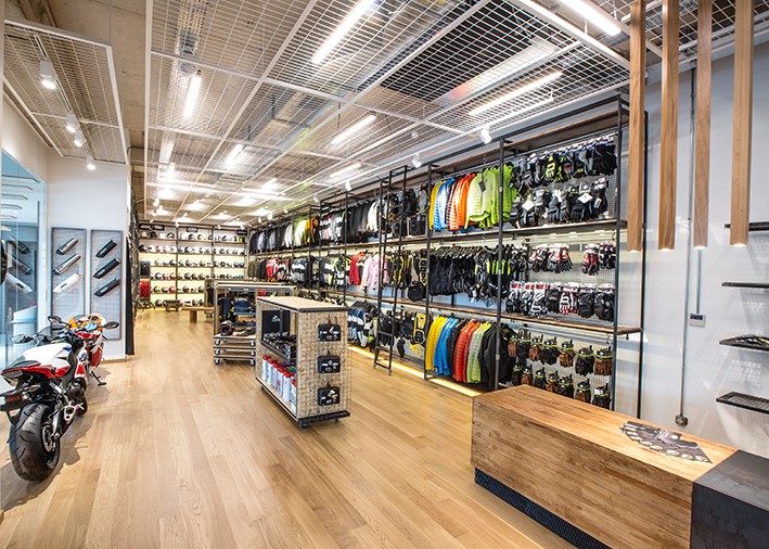 “Shop in shop” konseptiyle tasarlanan ve motosiklet tutkunlarının ihtiyacı olan tüm aksesuar ve tamamlayıcı ürünlerin yer aldığı mağazanın ferah iç mekanı ürünlerin tümü müşterilerin görüş açısında olacak şekilde tasarlanmış. Aynı katta yer alan yönetici odası ve açık ofis alanının tam karşısındaki büyük camın, bahçede konumlandırılan Bonzai tip zeytin ağacına bakması, doğanın iç mekanla buluştuğu bir etki oluşturmuş. Giriş kat ve servis alanında tüm tesisat ve alt yapı sistemleri dekorasyonun bir parçası olarak ön plana çıkarılırken; yakalanan endüstriyel hava ile aynı zamanda ekonomik bir uygulama ve bakım/onarım kolaylığı da sağlamış.