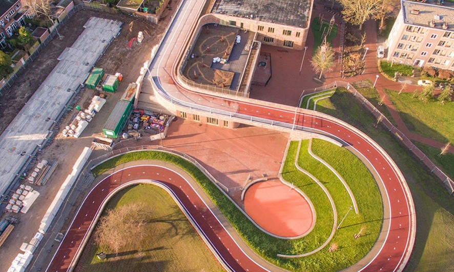 Hollanda’nın Ultrecht kentinde yeni yapılan köprü yalnızca yaya ve bisikleti olarak iki görevle yetinmiyor aynı zamanda kamusal parkla çevrili bir okulun çatı bahçesini oluşturuyor.
