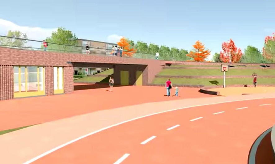 Kentin eski ve yeni ki yerleşim bölgesini birbirine bağlayan köprü yerel bir okulun da çatısından geçiyor. NEXT mimarlarından Marjin Schenk bu tasarımın toplumun kesintisiz bağlantılarını kurmak için yaptıklarını açıklıyor. Döngü rotası, park , okul bir araya getirilerek alt yapı mimari ve manzara kazanımı sağlıyor.