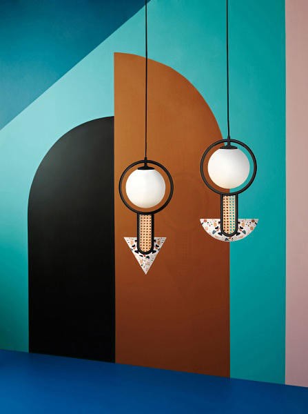 Terrazzo'nun bu fonksiyonel özelleştirilebilir ve dekoratif nitelikleri onu tasarımcıların iç mekanlar için tercih ettiği kullanışlı bir malzeme haline getirirken, aynı özellikler onu ürün tasarımcıları için de rağbet gören bir malzeme haline getiriyor. Su geçirmez terrazzo'nun uzun ömürlü dayanıklılığı, mozaik benzeri desenle mümkün olan monoton estetikle tamamlandığında, Urbi et Orbi'nin duvara asılan Balcony lavabosunu bir fırsat haline getiriyor. Ve Mambo Unlimited Ideas terrazzo'nun renk paletlerini birbirine bağlama kabiliyetini son derece başarılı bir biçimde kullanarak aydınlatma sarkıtlarının çelik yapısının koyu mavilerini ve siyahlarını, rattan deseninin sıcak sarı tonu ve ışığın kendisinin yumuşak beyazı ile birleştiriyor ve tüm bunlara geometrik bir terrazzo parçası ekleniyor.
