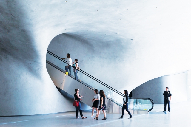 Arı kovanı benzeri dizaynı kübik binanın iç mekanlara filtrelenmiş bir gün ışığı almasını sağlamakta. Müzenin asansörleri köşelere yerleştirilmiş ve lobide karşılanan misafirler buralara doğru yönlendirilmekte. Ziyaretçiler asansörlerle difüz aydınlatılmış kolonsuz devasa bir galeriye ulaşıyorlar. 7 metre tavan yüksekliği ile oluşturulmuş bu görkemli galeri her türlü ve her boyutta sergiye uygun bir galeri.