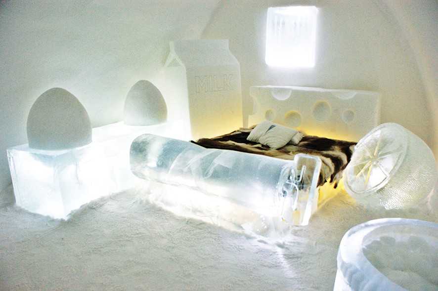 Torne Nehri, Ekim ayında donmaya başlıyor ve Mart ayına kadar buz kalıyor. Otelin iç mekânlarında kullanılmak üzere, bir yıl önceden, 4.000 ton buz bloğu depolanıyor. Yaz aylarında saklanan bu bloklardan 65 odası bulunan otelin duvar ve mobilyaları yapılıyor. Binanın yapımında toplam 30.000 metreküp “snice” yani kar/buz kullanıyor.