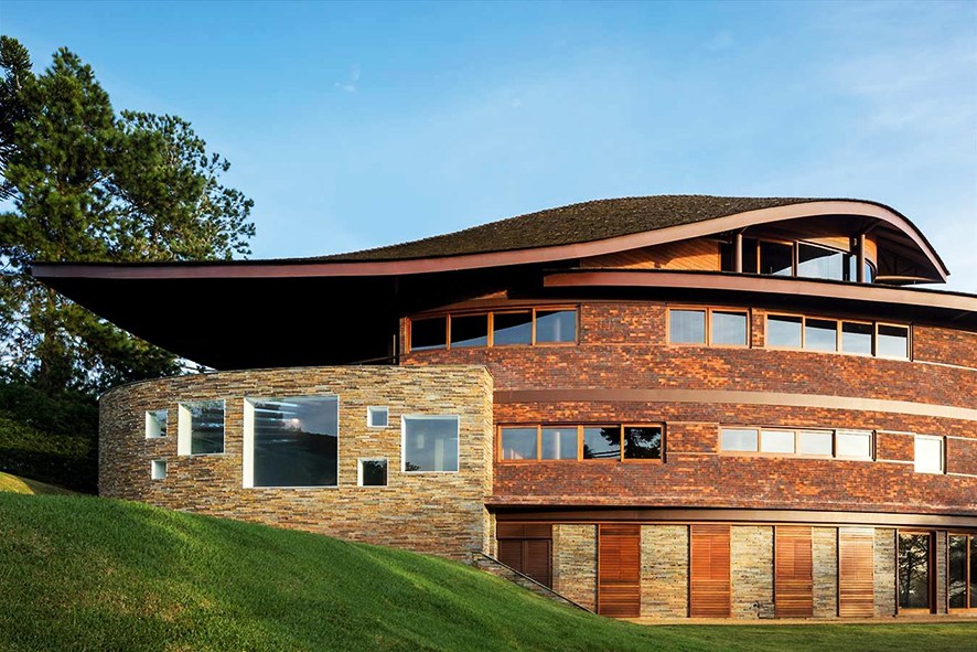 Brezilya’da Campos do Jordão şehrine bağlı São Paulo’da bulunan Casa Pinhão’nın tasarımı Patalano Arquitetura’ya ait. Mimar, bölgede yaygın olan alışılmış Avrupa mimarisinden farklı bir tasarım yapma fikrinden yola çıkarak çevreyle uyumlu bir yapı tasarlamış.