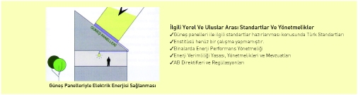 Öneri Standart: Güneş panellerinden elektrik elde etmek isteyen konutlara emlak vergi indirimi, güneş panellerinden KDV alınmaması, kredi ve teşvik mekanizmalarının oluşturulması, elektrik fazlasının satın alınma garantisi vb. uygulamalar hemen başlatılmalıdır. Çatıyla uyumlu, binanın yüzey alanlarında estetiği bozmayacak güneş panelleri kullanımının yanı sıra, toplu konut alanı içinde güneş ısı-ışığı açısından en uygun alan seçilerek, merkezi elektrik sisteminin beslenmesi de mümkün olduğunca sağlanmalıdır.