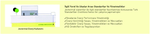 Öneri Standart : Jeotermal akışkanın kompozisyonu, kuyu başı debisi, jeotermal kaynak sıcaklığı, enerji kullanım yoğunluğu, jeotermal kaynak derinliği, jeotermal kuyularla uygulama yeri arasındaki uzaklık, alternatif enerji maliyetleri, tasarım parametreleri, kuyu başı ve kuyu içi ünitelerinin seçimi, jeotermal dağıtım sistemi, sıcaklık düşümü, sistem yük faktörü ve toplam yükü, son kullanıcı üniteleri, ısıtıcıları, uygun malzeme seçimi gibi kıstaslar gözden geçirilerek, sistemin ekonomik ve uygulanabilir sınırlar içerisinde kalıp kalmadığı iyi tetkik edilmelidir. Toplu konut hane sayısı, toplam ısınma ve sıcak su ihtiyacına göre, eğer yörede jeotermal kaynaklar varsa, merkezi ısıtma ve sıcak su sistemlerinin jeotermal enerji ile kurulması zorunlu ve öncelikli olmalıdır.