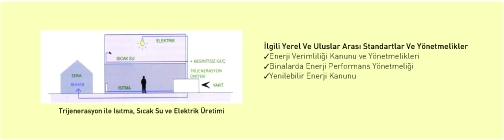 Öneri Standart: Eğer yörede jeotermal enerji kaynakları, etkili güneş ışınları ve ısı pompası uygulamaları yoksa veya uygun değilse, toplu konut hane sayısı, toplam ısınma, sıcak su ve elektrik ihtiyacı göz önüne alınarak bir kojenerasyon tesisi kurulması zorunlu ve öncelikli olmalıdır. Kojenerasyon yasası ve teşvikler acilen çıkarılmalı ve desteklenmelidir.