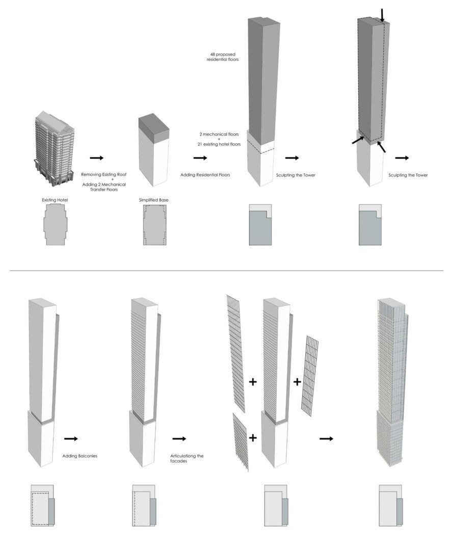 Sürdürülebilir mimari Cambridge Suites, Kanada'nın en yeni uyarlanabilir yeniden kullanım binalarından biridir. Orijinal Cambridge Suites Hotel, 1990 yılında WZMH Architects tarafından tasarlanmış. Şimdi WZMH ekibi, mevcut 21 katlı binanın beton yapısını korumak için karma kullanımlı binayı yeniden tasarladı. Aynı zamanda konut gelişimi için eklenen 50 yeni katı desteklemek için ek yapısal ve tasarım değişiklikleri yapıldı.