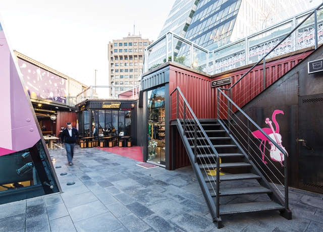 Bireysel modülleri ve esnekliğe sahip tasarımı ile 15’ten 90 m2’ye kadar değişen farklı modelleri birleştiriyor. Mekanın doğru ve esnek kullanımını en üst düzeye çıkartmak adına, mevsim uygunluğu yakalandığı durumlarda konteynerlerin duvar ve tavan alanları açılabiliyor. Böylelikle yaz döneminde güneş ışığı kullanım oranı arttırılırken soğuk dönemlerde kapalı hale getirilen alanlar ısıtma sistemi sayesinde yaşamaya uygun bir formata sahip oluyor. Mal sevkiyatı sırasında bir tampon bölge görevi de gören gizli hizmet koridoru aynı zamanda servis asansörü aracılığıyla mağaza/restoran olarak kullanılan konteynerleri zeminde yer alan depo bölgelerine bağlıyor.