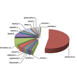 Yeşil Yıldız sahibi 97 tesisin illere göre dağılımını aşağıdaki grafikten görebilirsiniz. Antalya toplamda 51 tesis ile başı çekmekte olup, arkasından İstanbul, İzmir ve Muğla gelmektedir.