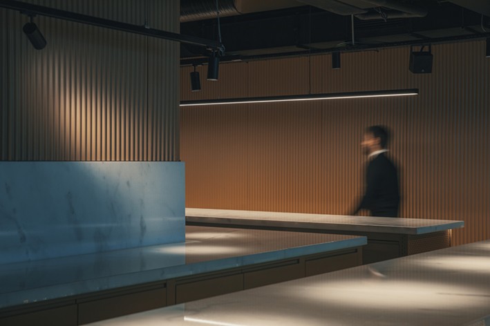 Mekana özel olarak tasarlanan yemek sandalyeleri ve bar sandalyeleri ile bu yalın tavrın içine görünür olan öğeler ekleyen URBANJOBS, masaların üzerine odaklanan aydınlatma ile neye vurgu yapılması gerektiğini anlatıyor.