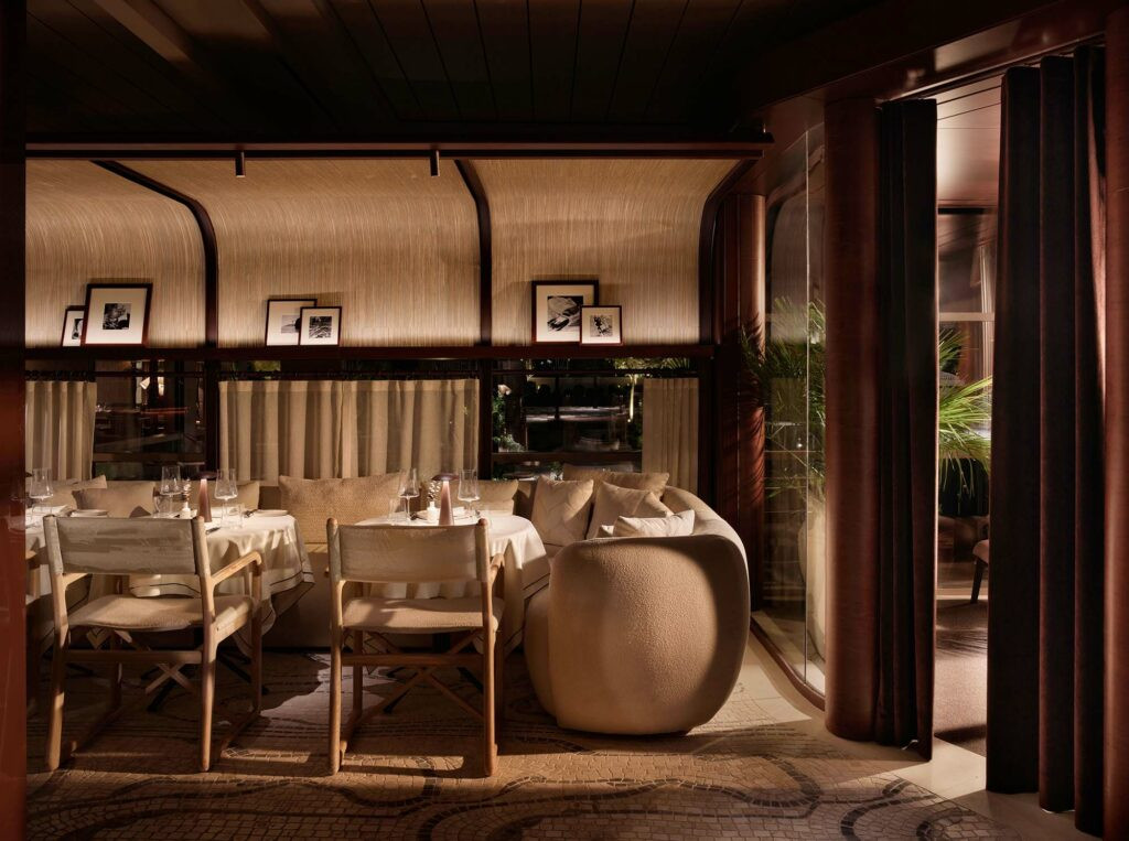 Dış mekanda, pergola ile örtülü alanın üzerinde yer alan eğrisel üst yapılar, aydınlatma ve akustik konfor çözümlerini barındırıyor. Kanepelerin arkasına konumlandırılan eğrisel ayırıcılar mekansal derinlik ve tanımlama sağlayarak çeşitli malzemelerle bütünleştirilip bu benzer yapısal dil, iç mekanda da devam ettirilmiş. Sistem, bakır kaplamalı özel alüminyum destekler kullanılarak inşa edilirken ahşap, deri ve açık tonlu mermer detaylarla tamamlanmış. Entegre duvar aplikleri, masa ve zemin lambalarının yapısal formlarına ilham vererek mekansal bütünlüğü güçlendirirken URBANJOBS’ın cam perde olarak tanımladığı cephe, zemin desenleri ve mobilya detaylarında tekrarlanan bu unsurlar, kesintisiz bir görsel ve işlevsel ritim yaratmış. Scalla’nın metal çerçeve sistemi, servis istasyonlarından arka barlara, entegre raf ünitelerinden cephe teşhir sistemlerine kadar farklı işlevsel alanlarda kullanılarak mekansal kimliği tutarlı bir şekilde güçlendirmiş. Tavan, farklı ihtiyaçlara yanıt verecek şekilde mekanı bütünleştiren bir mimari yüzey olarak tasarlanmış. Bazı alanlarda yükseltilmiş, bazı bölümlerde ise strüktürel kirişlerle geçişler tanımlanmış. Belirli bölümler örme deri ekler ile vurgulanırken daha düşük tavan yüksekliklerine sahip alanlarda, ev hissi veren samimi bir atmosfer oluşturulmuş.