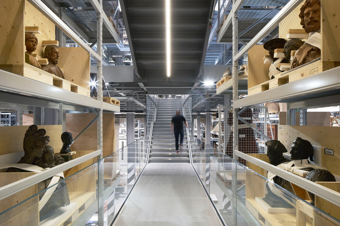 Bu geçiş koridoru boyunca uzanan metal raf sistemleri, hem depo işlevi görüyor hem de koleksiyondan parçaların sergilenmesine olanak tanıyor.