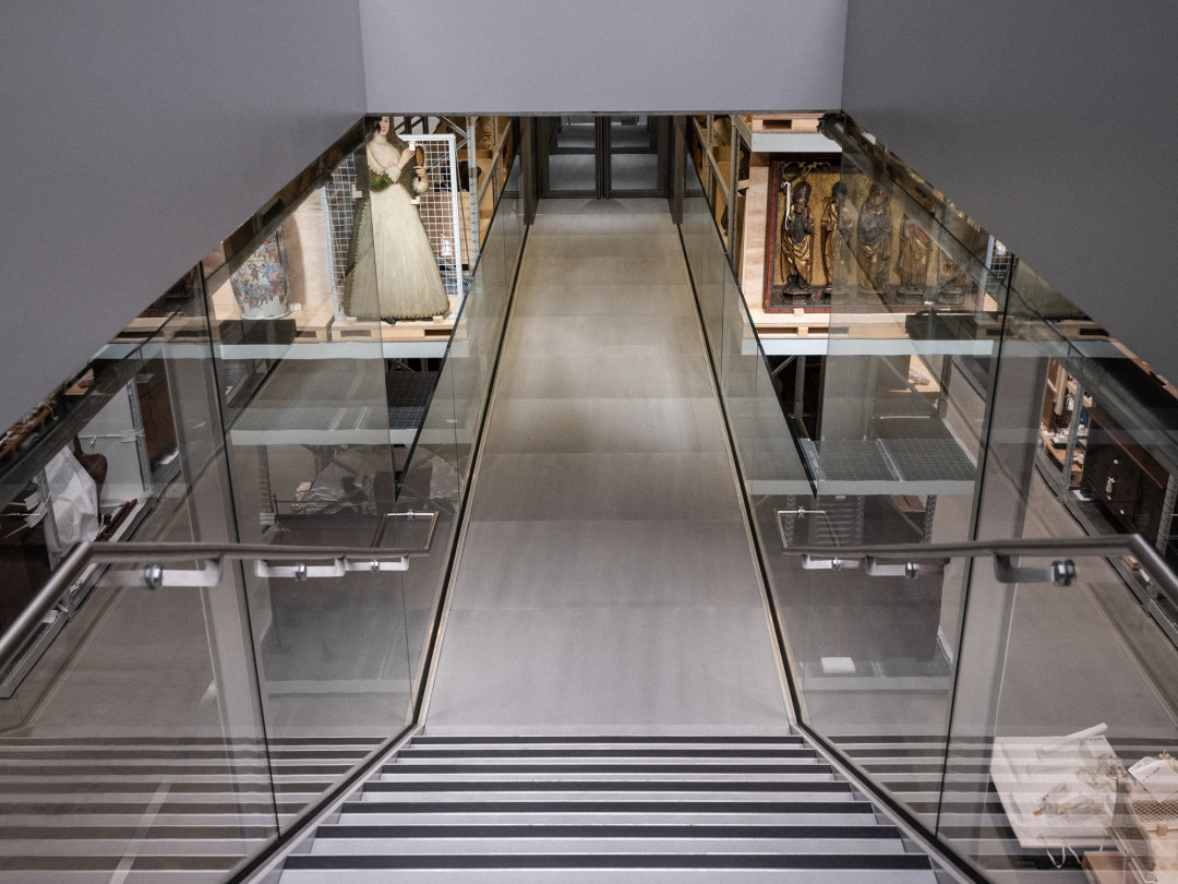Metal kafes zeminler ve cam korkuluklar, koleksiyonların etrafında dolaşmayı hem güvenli hem de şeffaf hale getiriyor. Böylece ziyaretçiler, üç kata yayılan objeleri katmanlar arasında izleyebiliyor.