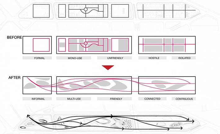 Tasarım, bu kentsel vahaya, kullanıcı deneyimi ve yer oluşturmaya vurgu yapmasının yanında, aynı zamanda 21. yüzyılın sosyal ve çevresel sürdürülebilirlik gereksinimlerini karşılayarak gayri resmi bir alana dönüştürüyor. Tasarım resmi, düşmanca olmayan ızgaradan vazgeçerek; resmi olmayan, çok amaçlı, arkadaş canlısı, bağlantılı ve sürekli bir hale geliyor.