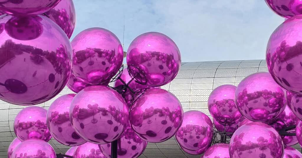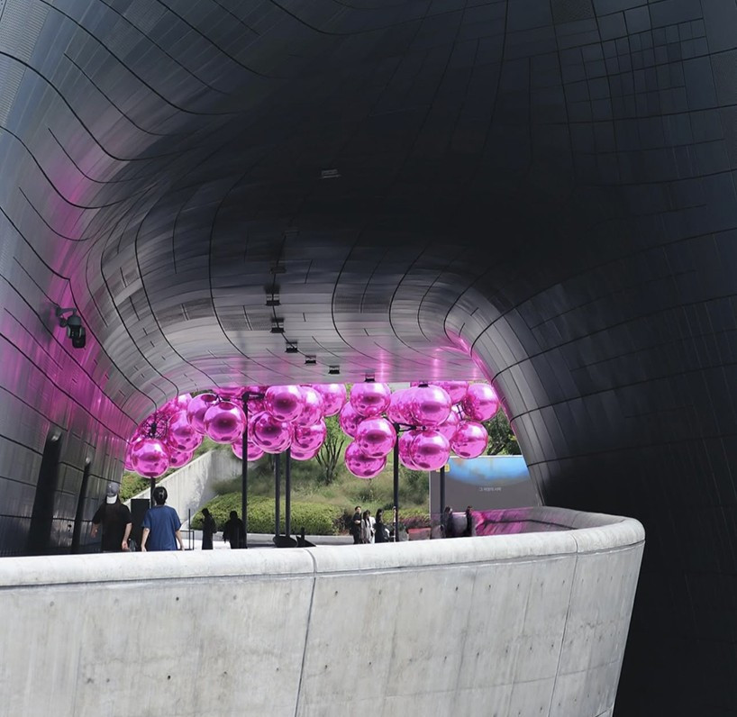 Dongdaemun Design Plaza (DDP), hiç şüphesiz Seul’ün en çarpıcı yapılarından biri. Bina bu kez sanat ve mimarlığın kesiştiği bir buluşmaya ev sahipliği yapıyor. Fransız sanatçı Vincent Leroy’un “Molecular Cloud” adlı kinetik heykeli, Zaha Hadid’in futuristik tasarımına karşılık parlak pembe küreleriyle selam duruyor.