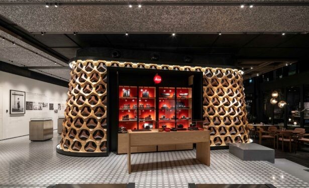Bir müze, kafe ve fotoğraf makinesi mağazasının 435 metrekarelik alanda birlikte çalışması gibi zorlu bir tasarım ihtiyacına yanıt arayan Wangan’ın projedeki ana tasarım kararı, bu farklı fonksiyonları ayrı ayrı ele almak yerine, deneyim hikâyesini markaların ortak noktaları üzerine kurgulamak oldu. Mekânın ortasına üç boyutlu ahşap bir desenle kaplanarak yerleştirilen ve Monochrome’un mutfak alanını içinde barındıran ana kütle, üç markanın ortak noktası olan fotoğrafçılığın ve fotoğraf makinesinin temel ögelerinden olan diyafram açıklığının (apertür) geleneksel formundan esinlenilerek tasarlandı. Yüzeyinde Leica’nın vitrin ünitelerinin ve Ara Güler Müzesi’ne ait sergileme yüzeylerinin yer aldığı bu kütle, üç boyutlu yapısı sayesinde üzerinde yaratılan ışık oyunlarıyla mekanın içinde olduğu kadar dışından da dikkat çekerek projenin en baskın öğelerinden biri haline geliyor.