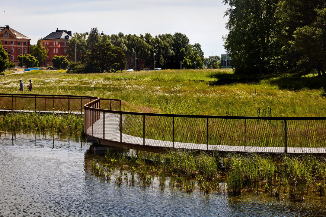 İsveçli White Arkitekter, İsveç'in Uppsala kentindeki Exercisfältet Stormwater Pond'u tamamlayarak su arıtma ve taşkın koruması sağlarken aynı zamanda yerel sakinler için biyolojik çeşitliliğe sahip bir peyzaj oluşturdu. Gölet son zamanlarda su sızmasını azaltmış, büyük miktarda yapılaşmaya maruz kalmış eski bir askeri eğitim alanı olan Exercisfältet'te yer alır.