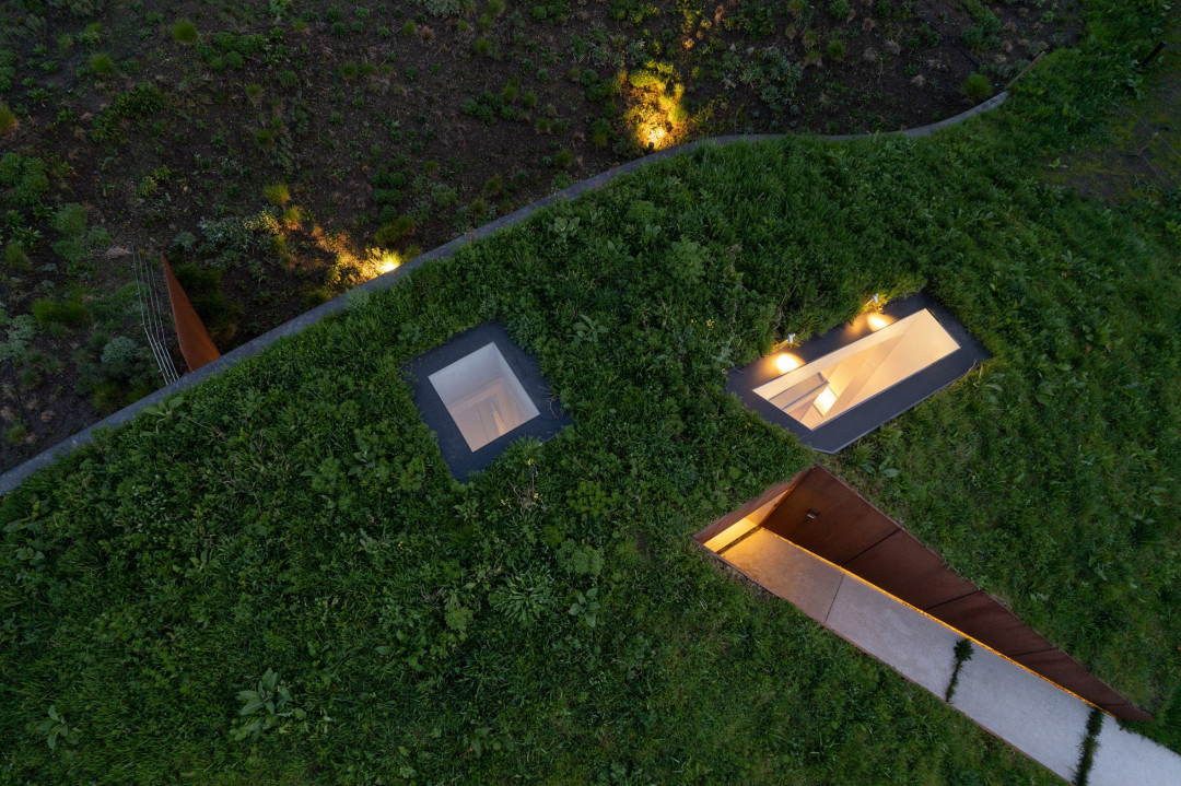 Tarlanın kenarından eve yaklaşırken, kır çiçekleriyle çevrili bir patika, yamacı kesen Corten çelik kaplı bir koridora götürür. Burada, büyük bir pivot kapı, geniş bir yemek odasına ve ötesindeki vadinin cömert manzarasını sunan mutfağa açılıyor. Kavisli çatının kemeri, gözü bodrum katına inen bir boşluğa yönlendiriyor. Sürdürülebilir mimari House Under the Ground cam bir platform asansörü barındıran bu merkezi boşluğun etrafında düzenlenmiş. Bu, evin gelecekte tekerlekli sandalye dostu olmasını sağlarken zeminin altındaki odalara ışık getiriyor.