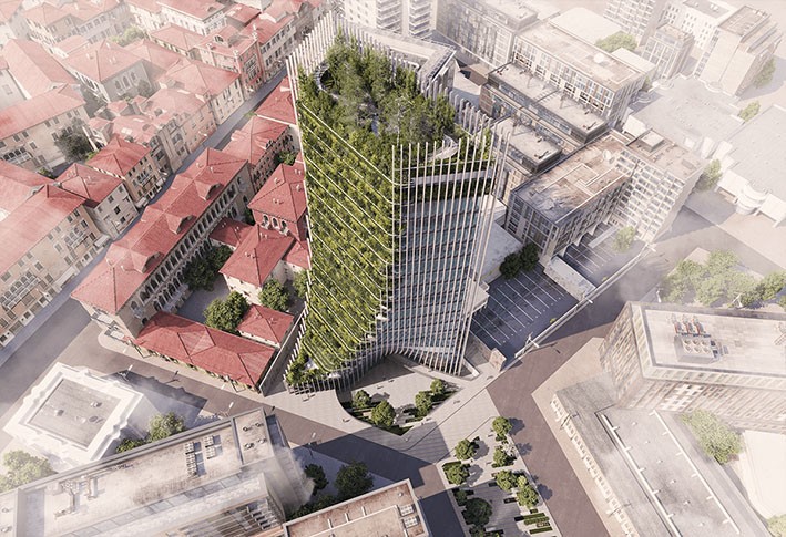 Gölgelik: Bina boyunca uzanan bitki örtüsü “şelalesi” şehri gökyüzüne bağlıyor, oksijen üretiyor, ışığı filtreliyor ve binada çalışanların refahını artırıyor.