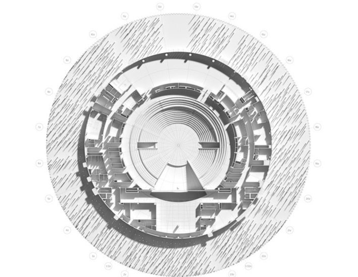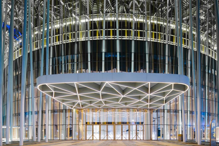 Geceleri, bina zarfı aşağıdan aydınlatılır, “bambu” sütunların ormanı arasında bir anlığına görülen ruhani bir işaret haline gelir, seyircileri ve izleyicileri gölün ve çevredeki gelişmeden çeker.