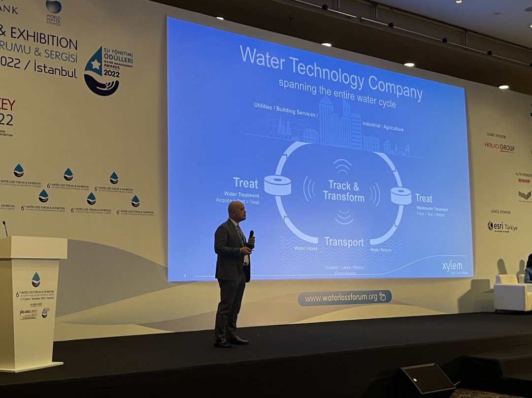Konuşmasında dünya genelinde yılda toplam 126 milyar metreküp su kaçağı olduğunun altını çizen Altuğ Bilgiç, “Dünyada kişi başına günde 77 litre su kaybı mevcut. Yalnızca Avrupa’da su kayıp ve kaçağı yüzde 25 seviyelerinde. Su kaybının dünya ekonomisine yansıması ise yıllık 39 milyar dolar değerinde. Tüm kaçak suların atmosferde meydana getirdiği karbondioksit salımını bertaraf etmek için Brezilya’nın toplam dörtte biri kadar yeni ormanlara ihtiyacımız var. Oysa günümüzde ileri teknoloji ile su kayıplarını kolaylıkla tespit etmek, hatta kestirimci bakım sayesinde kayıp meydana gelmeden riskleri belirlemek ve yönetmek mümkün. Örneğin, Xylem’in patentli teknolojisi olan Smart Ball, boru hattında günde 30 kilometre yol katederek noktasal su kaçaklarını tespit edebiliyor. Bir diğer inovatif ürünümüz olan Pipe Diver ise kaçak olması muhtemel yerleri tespit ederek su kayıplarının önüne geçiyor.” dedi.