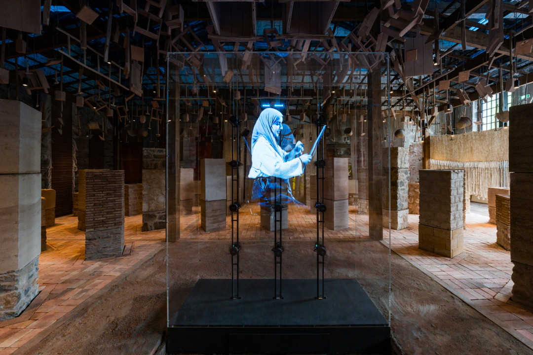 Bienal’in bu yılki temasıyla uyumlu olarak geliştirilen sergi, kolektif zekâyı yapı üretimi üzerinden ele alıyor. Mimarlık, zanaatkârlık ve dijital teknolojilerin buluştuğu bu ortamda, toplum temelli yapı üretimi ve bilgi aktarımı ön planda. Pavyonun merkezinde, iki yerel ustanın hologramla canlandırılmış çalışma performansları, izleyiciye unutulmaya yüz tutmuş teknikleri yeniden hatırlatıyor.