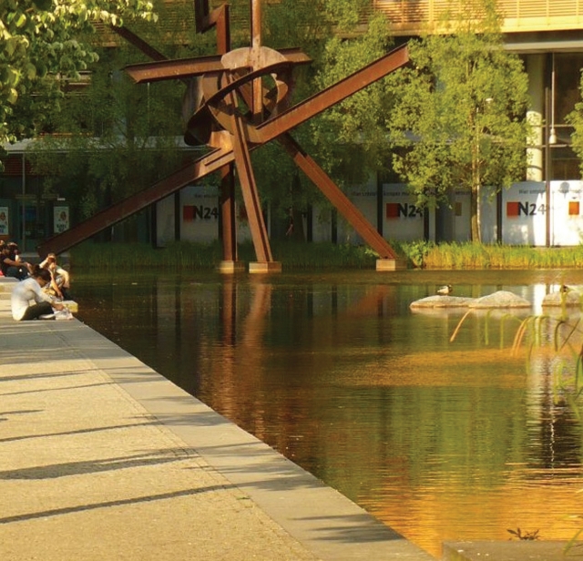 çatılarında oluşturulan yeşil çatı bahçelerinde yağmur suyu toplanarak süzdürülmekte ve daha sonra yeraltındaki su sarnıçlarına yönlendirilerek yapılarda kullanılmaktadır. Sarnıçlar yine toplanan suyun bir kısmını kentsel mekanda yapılan büyük bir laguna’ya aktarmakta, burda üretilen sazlıklar ile suyun biyolojik olarak temizlenmesi sağlanmaktadır. İleri arındırma işlemleri yine bu laguna içindeki mekanik filtrelerle gerçekleştirilmektedir. Bu tasarımın faydaları sadece teknik değil, estetik ve hatta eğiticidir.19 Bu tasarım sayesinde bir yeşil altyapı projesi ve işleyiş sistemi kamuya açık bir alanda sergilenmektedir.
