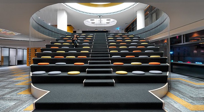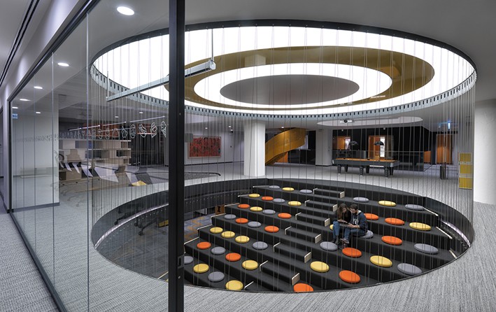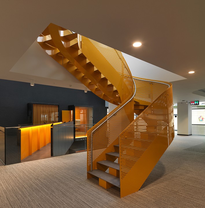 4. kattan 5. katın doğu kanadına kadar mevcut kat kesilerek tribün benzeri merdivenler, merdivenlerde de koltuklara bakan ekranlı perdeler yerleştiriliyor. Alan, kullanıcıların film izleyebilecekleri, spor müsabakaları veya konferans yapabilecekleri bir buluşma noktası oluşturmayı amaçlıyor. Bir hamak ağı ve 2 katlı kitaplık, bu alanı yine ikiye bölüyor. File, aynı zamanda boş zamanın değerlendirilebileceği bir sosyal alan olarak da hizmet vermektedir. Satranç ve diğer oyun özellikleri bu boş zaman etkinliklerinin bir parçasıdır. Renk bozulması sarı tonlarla tamamlanır. Katta müdürler tarafından özel toplantılar için kullanılan büyük bir toplantı odası bulunmaktadır. Ayrıca bu bölge, zemindeki dinamizmi destekleyen sarı merdivenlerle çatı katına erişime sahiptir.