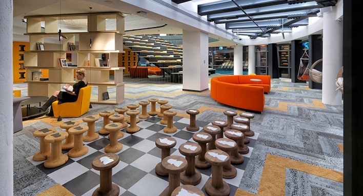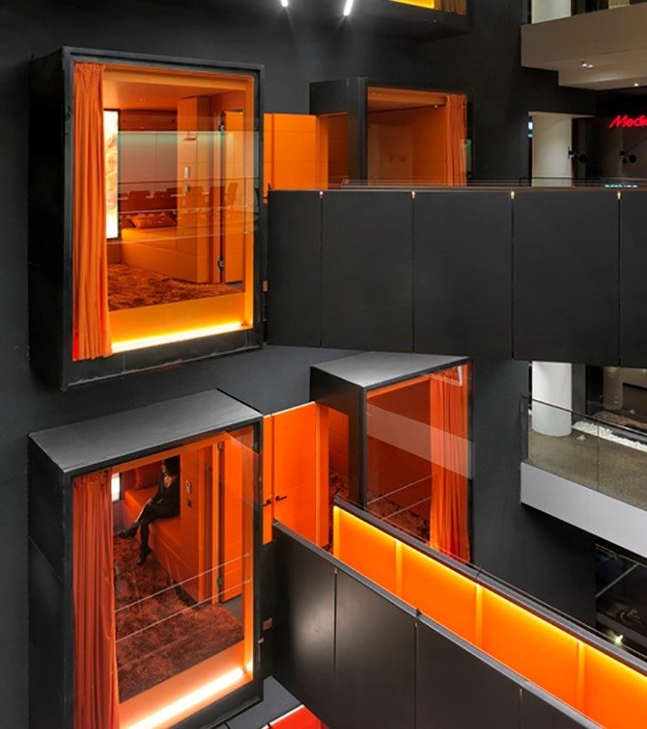 Kullanıcıları, girişte uçan köprülerin olduğu ve beş kat yüksekliğindeki bir galeri boşluğu karşılar. Buradaki köprülerin her birinin benzersiz bir adı ve tema rengi vardır. Bu köprüler katları uyku odaları ile bağlarlar. Uyku odaları da tema renklerine ve isimlerine uygun olup, her biri 8 m² alana sahiptir. Bu uyku odaları bina içinde kendi kendini yenileyen alanlar olarak çalışırlar.