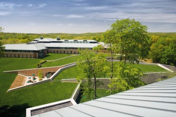 Afetin şiddetine karşın araziye sessiz bir konumlanış sağlayan müze, yeşil çatısıyla birlikte peyzajla bütünleşiyor.