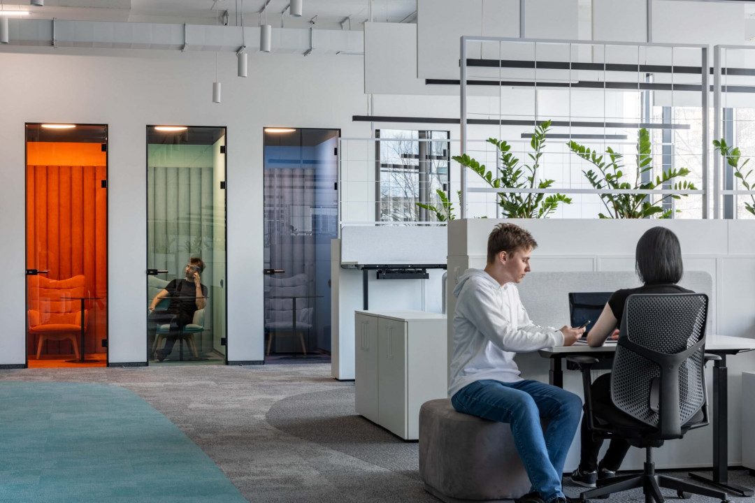 Ahşap, doğal taş, geri kazanılmış metal ve tekstil ürünleri, ofise sıcaklık ve kimlik kazandırır.