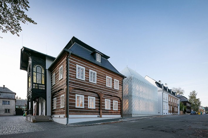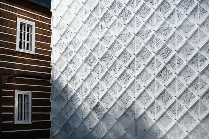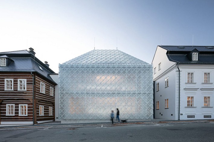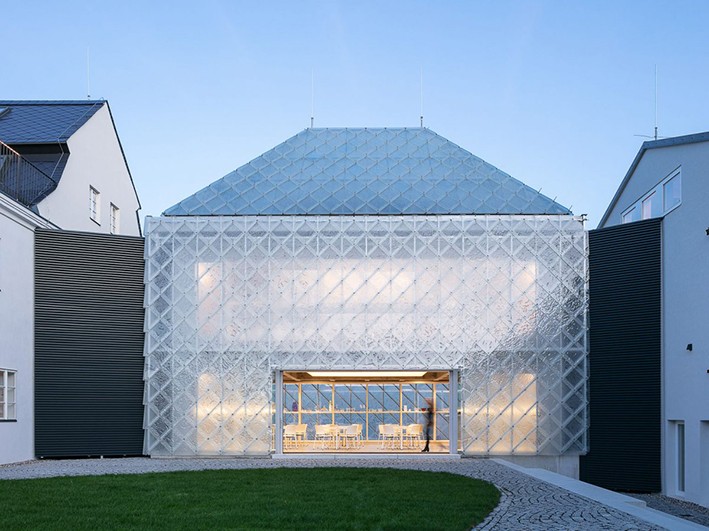 Bölgenin geleneksel arduvaz çatı kiremitlerinden esinlenerek tamamen cam kiremitlerle kaplanmış olan Lasvit'in cam evi, yerel ve eski yapım geleneklerini Maison'ın öncü malzeme araştırmalarıyla birleştirerek hem asırlık cam yapım zanaatını hem de onun izlerini sürebilen tarihi kenti yüceltiyor.