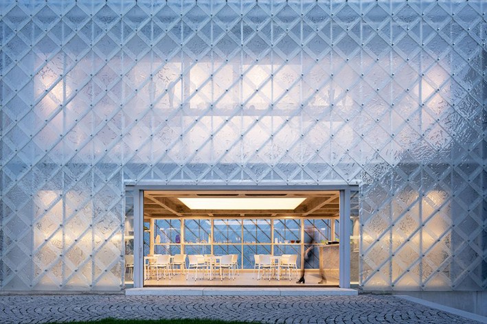 İçeriden parıldayan bu cam ev, boyutları 60x60cm ile 60x120cm arasında değişen 1400'ün üzerinde cam karo ile donatılmış ve kendini destekleyen dış iskeletten oluşuyor. Her bir karo 8 mm kalınlığında ve birlikte cephe ağırlığı 14 ton gibi şaşırtıcı bir ağırlıktadır. Lasvit, Milano'dan Dubai'ye özel tasarım fuarları olan kinetik cam enstalasyonlarıyla tanınırken, burada temel uzmanlıkları olan zanaatkar camın inovasyonuyla ustalıklarına geri dönüyorlar.
