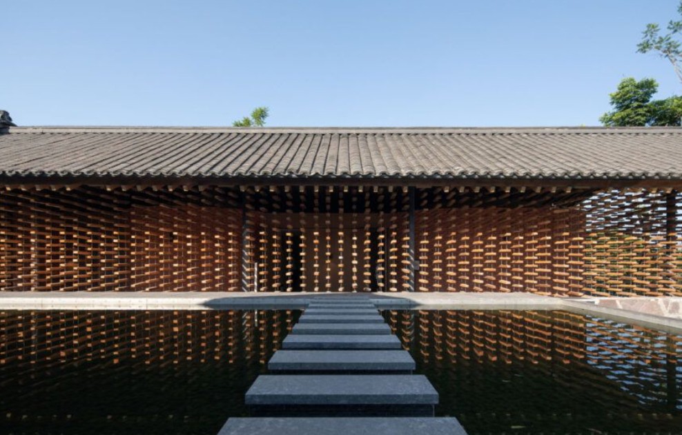 Çin'in Sichuan eyaleti Yibin şehri, Anshi köyünde bulunan modern bir bina olmasına rağmen geleneksel inşaat tekniklerinden tam olarak yararlanarak çevresiyle uyum sağlıyor. Karma mimari açık ahşap dış duvarları ve geniş saçakların altında dalgalı tuğlaları olan bir Sansui Takien inşa edildi. Ev, hem tarihi hem de heykelsi yeni bir görünüm kazandıran, yansıtıcı bir havuzun etrafında dolanıyor.