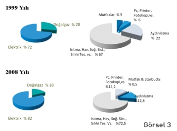 1999 Yılındaki enerji tüketim analizi ve 2008 yılında yapılan ara değerlendirme analizi ile tüketimin bina içindeki dağılımı ve meydana gelen değişimlerin çalışma dönemi içinde karşılaştırmaları yapılmıştır.(Bkz. Görsel 3)